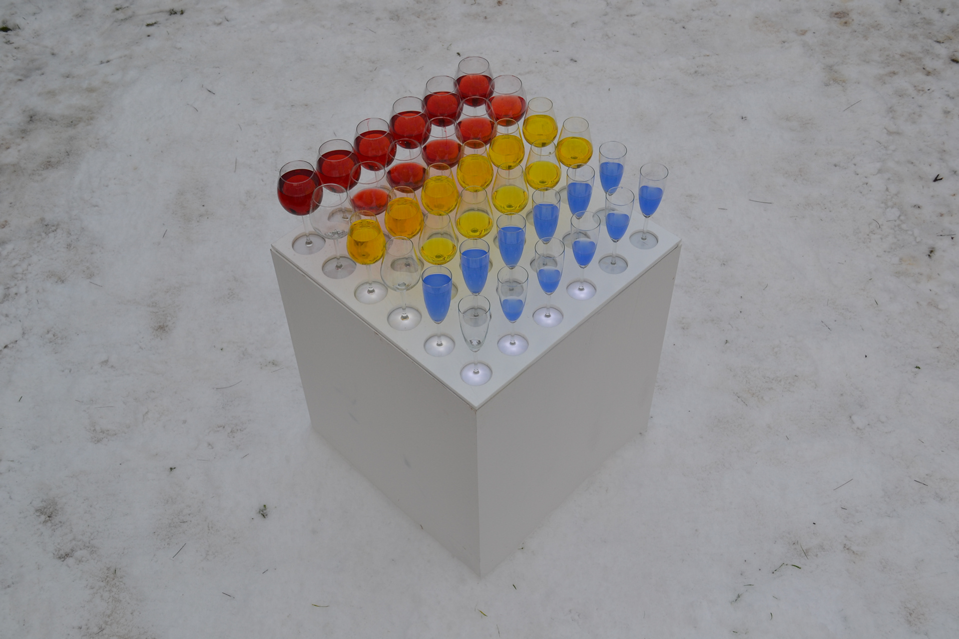 This project was in response to a client brief for Cryptic. The brief was very broad and there were many themes for the project. I was experimenting with sound using found objects in my home, when I came across wine glasses which are refereed to as glass harps. These glasses when you rub a damp finger around the rim vibrate creating sound. This lead me to create a sound sculpture using wine glasses, I decided to use 3 octaves which meant I needed 36 glasses. The amount of water in each was variable to allow me to have the desired pitch when played. I decided to use three different colours red, yellow and blue to signify each different octave.